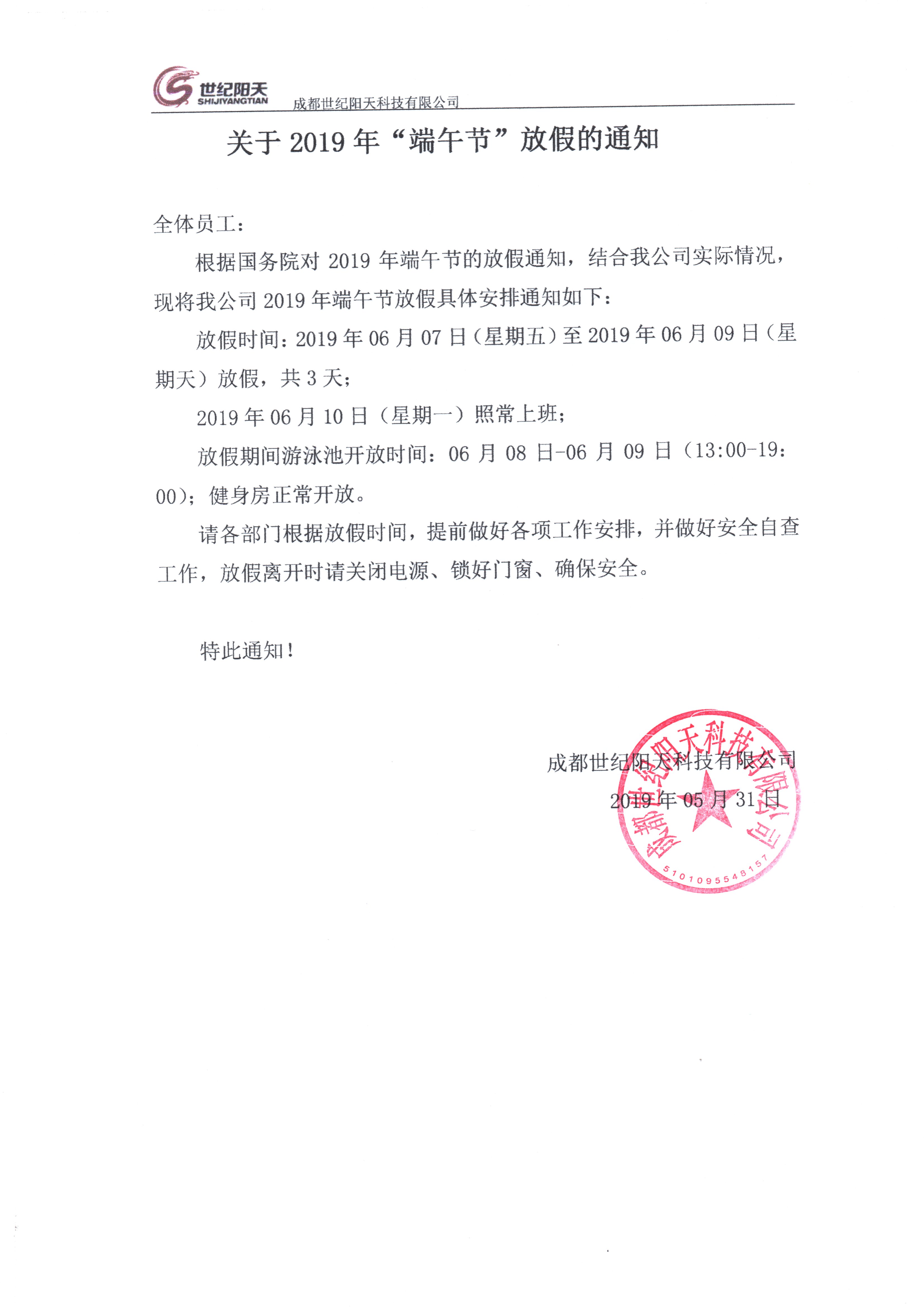 全體員工: 根據(jù)國(guó)務(wù)院對(duì)2019年清明節(jié)的放假通知,結(jié)合我公司實(shí)際情況,現(xiàn)將我公司2019年清明節(jié)放假具體安排通知如下: 放假時(shí)間:2019年04月05日(星期五)至2019年04月07日(星期天)放假,共3天;2019年04月08日(星期一)上班。 放假期間游泳池開(kāi)放時(shí)間:04月06日-04月07日(13:00...
