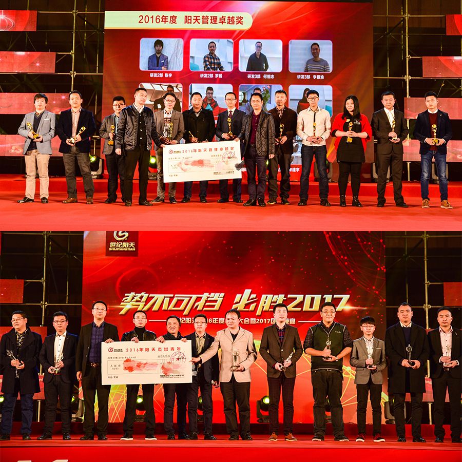 世紀(jì)陽(yáng)天今天的成就,除了有董事長(zhǎng)肖開(kāi)強(qiáng)先生的戰(zhàn)略領(lǐng)航外,也離不開(kāi)陽(yáng)天全體核心精英領(lǐng)導(dǎo)團(tuán)隊(duì)的共同努力。每一位陽(yáng)天的汗水和智慧,共同鑄就了世紀(jì)陽(yáng)天今日的輝煌。年會(huì)上對(duì)2016年度先進(jìn)員工、先進(jìn)管理者進(jìn)行了表彰,頒發(fā)了最佳貢獻(xiàn)團(tuán)隊(duì)獎(jiǎng)、陽(yáng)天杰出團(tuán)隊(duì)獎(jiǎng)、最佳貢獻(xiàn)個(gè)人獎(jiǎng)、陽(yáng)天管理卓越獎(jiǎng)、服務(wù)之星、支撐團(tuán)隊(duì)獎(jiǎng)、陽(yáng)天杰出青年等榮譽(yù)獎(jiǎng)項(xiàng)。